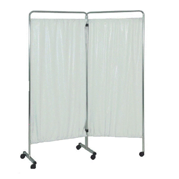 Biombo clínico plegable de dos cuerpos, estructura metálica (generalmente de acero pintado o inoxidable) con tela lavable e ignífuga. Ideal para dividir espacios, brindar privacidad durante exámenes o procedimientos en clínicas, hospitales y consultorios.