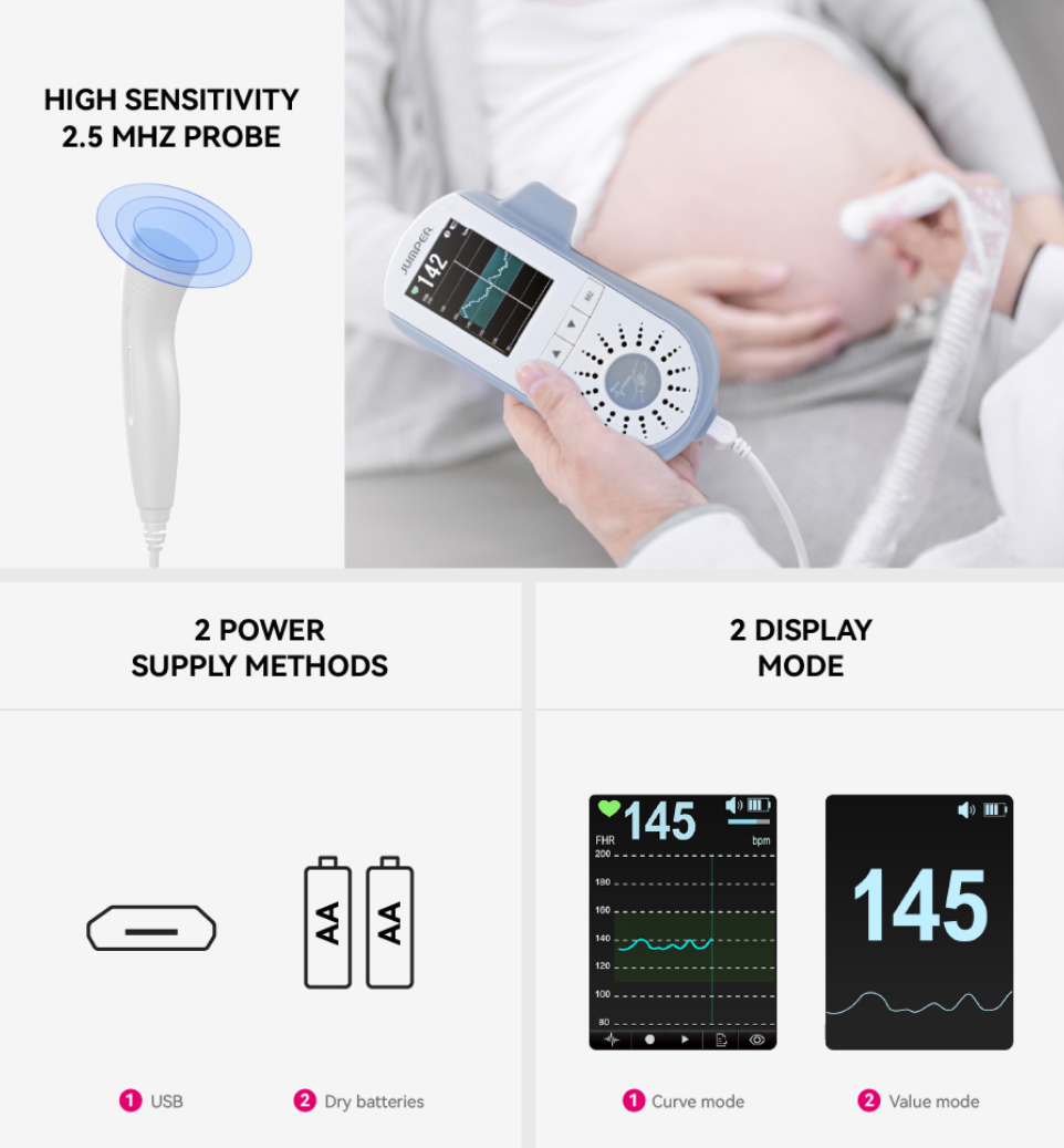 El Doppler fetal Jumper JPD-100E, tiene diseño portátil y elegante, con indicador de sonda que guía a la ubicación correcta, cuenta con tres modos de funcionamiento para satisfacer diferentes necesidades, tiempo real, promedio y modo manual, gran Pantalla LCD con luz de fondo, para visualizar la frecuencia cardiaca fetal numérico y gráfico. Indicación de la señal y la frecuencia de sonda, posee un algoritmo único de ritmo cardiaco para permitir un FCF más preciso y confiable.